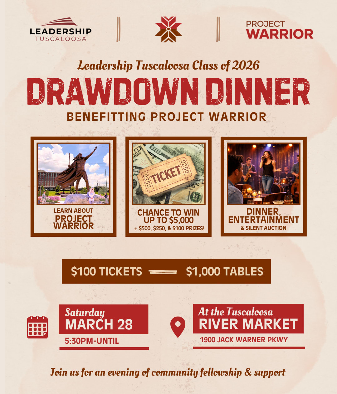 Get ready for an unforgettable night of food, fun, and fundraising at the Leadership Tuscaloosa Class of 2026 Drawdown Dinner, benefitting Project Warrior!