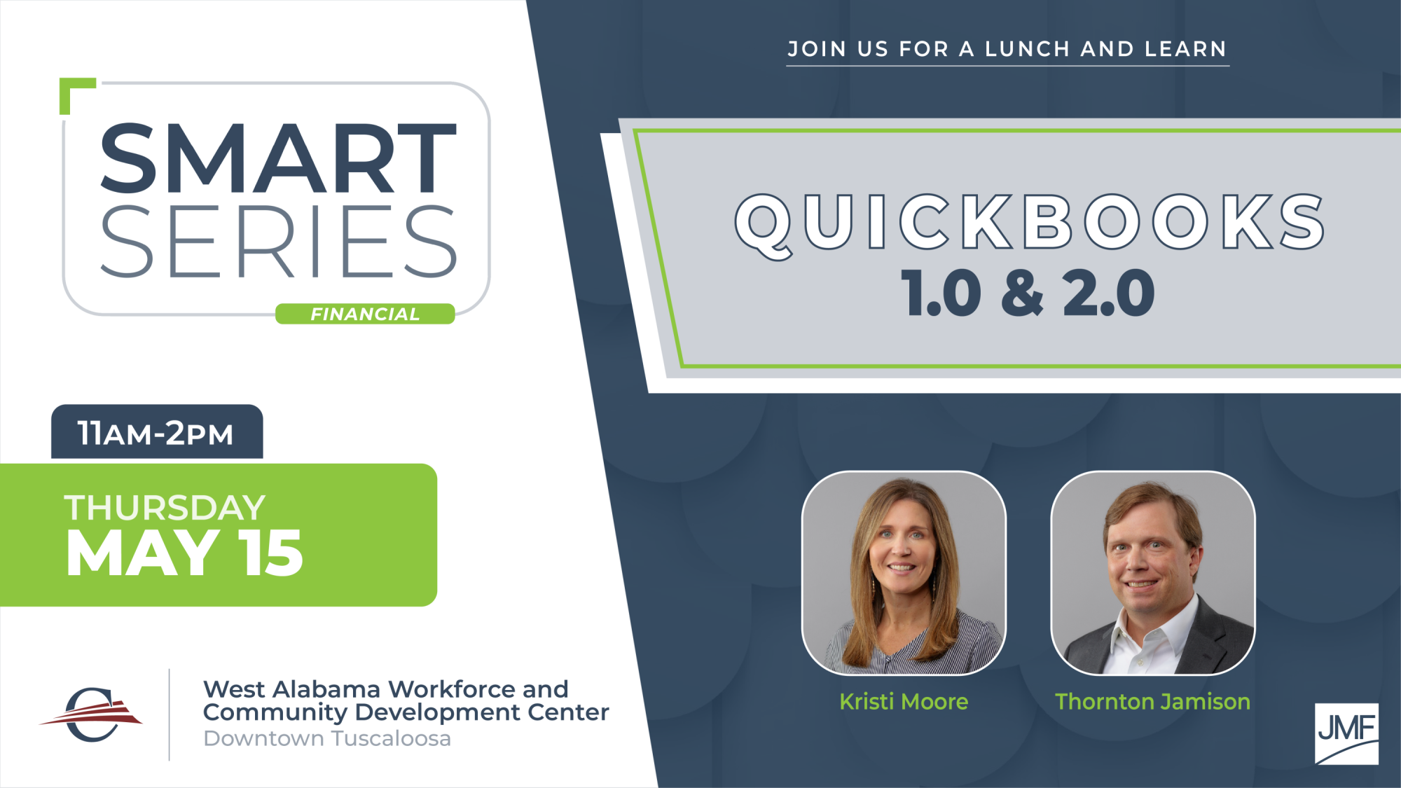 Please join us for a QuickBooks 1.0 & 2.0 Lunch & Learn with Kristi Moore and Thornton Jamison of JamisonMoneyFarmer PC.