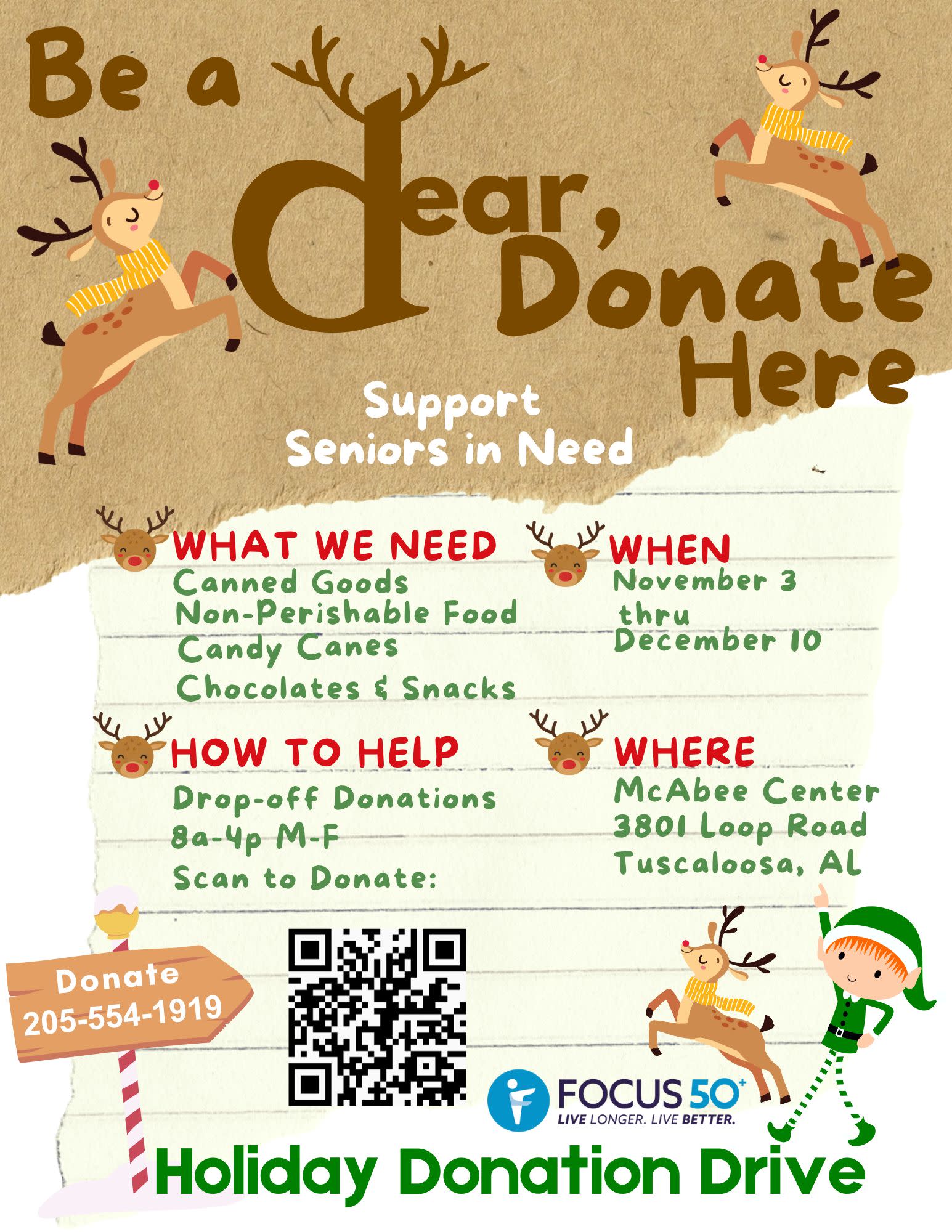 FOCUS 50+ Holiday Donation Drive Nov 3rd thru December 10th ❤️Warm the heart of a local senior by donating to the FOCUS 50+ Holiday Grocery Assistance Fund, ensuring our local elderly neighbors are remembered during the holiday season and always!