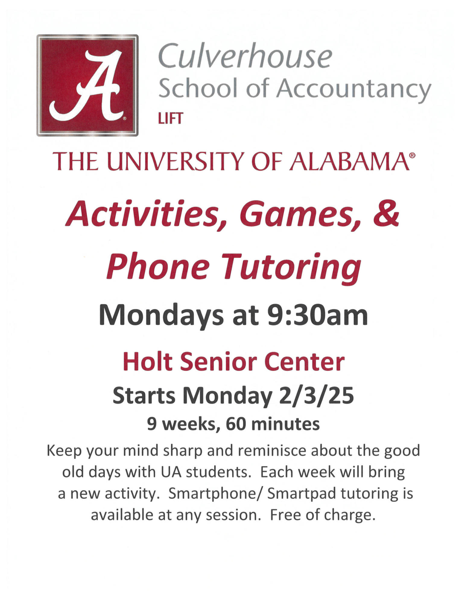 REGISTER HERE-Individual tutoring with a UA student, in partnership with FOCUS 50+ -Mondays beginning February 3rd at 9:30am -Classes 9 weeks, 60 minutes each -FREE -lift.culverhouse.ua.edu