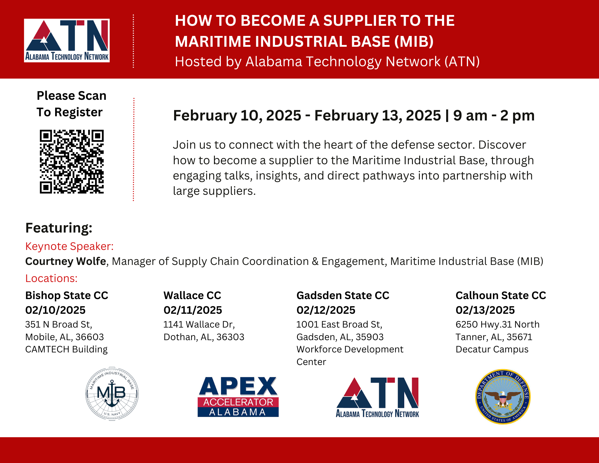 Join the Alabama Community College System, Alabama Technology Network, and SERCO to connect with the heart of the defense sector. Discover how to become a supplier to the Maritime Industrial Base through engaging talks, insights, and direct pathways into partnership with large suppliers.