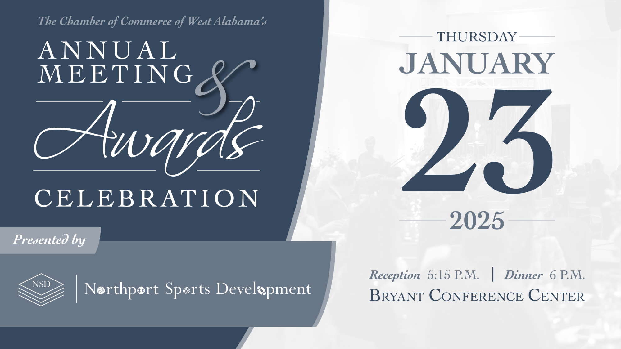 The Chamber’s Annual Meeting & Awards Celebration is the West Alabama business community's premiere event. It celebrates the Chamber's body of work over the past year by recognizing volunteers and business leaders who have made a significant impact on the organization's overall efforts. This early spring event celebrates the past but also ushers in a new Chamber year with the formal installation of the incoming Chairman of the Board of Directors. This is the best professional networking opportunity of the year!